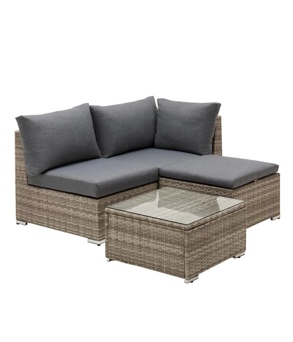 Die gleichmäßige Flechtstruktur und die lebendigen Farbnuancen des Geflechts verleihen dem Dehner Balkonset Como seine besondere Ausstrahlung, die an Rattanmöbel erinnert. Und damit liegen Sie schon fast richtig. Auch hier wurde jedes Möbelstück von Hand geflochten, nur dass es sich nicht um Natur-, sondern um Polyrattan handelt. Das heißt, Sie erhalten Outdoormöbel mit dem individuellen Charakter von Handarbeit, die jedoch zusätzlich unglaublich robust, pflegeleicht und wetterunempfindlich sind. Dass im Inneren ein Alugestell für Stabilität sorgt und obenauf hochwertige Polster mit abnehmbaren, waschbaren Kissenbezügen Komfort bieten, macht die Sache rundum perfekt.