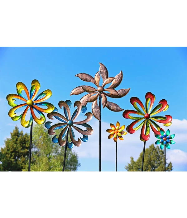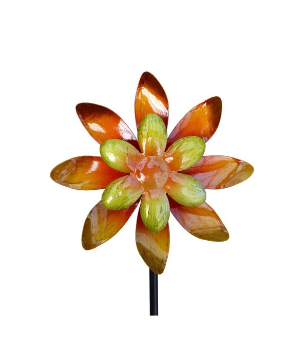 Üppige Sommerblumen und Stauden sind ein prächtiger Schmuck für den Garten wie den Balkon. Allerdings beschäftigen viele Sorten den Gärtner vom Frühjahr bis zum Herbst mehr oder weniger intensiv und im Winter hinterlassen sie auf den Beeten gähnende Leere. Mit dem Dehner Metall-Windrad können wir Ihnen eine neue Pflanzengeneration vorstellen, die sich mit einer imposanten Blüte schmückt, die nie verblüht, sondern vielmehr 12 Monate im Jahr dekorative Präsenz im Beet zeigt. Weiterer Pluspunkt: Das Dehner Metall-Windrad ist absolut pflegeleicht, es muss im Sommer nie gegossen werden und präsentiert sich selbst im Winter bei Frost und Schnee in gleichbleibenden Schönheit. Das Beste aber ist die Beweglichkeit der tollen Blüte, denn schon ein leichter Wind reicht, um die beiden Blütenräder in Bewegung zu setzen. Die Blüte aus wetterfestem Kunststoff hat einen Durchmesser von 22 cm, der Metallstab ist 140 cm hoch.