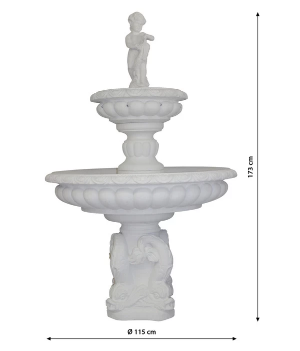 Als wäre er aus dem Park eines mediterranen Palazzos entführt, wirkt der Fantasieco Steinbrunnen Milano wie ein Relikt aus vergangenen Zeiten! Mit jedem Detail zeigt der Fantasieco Steinbrunnen Milano die damalige Freude an Schönheit und Prachtentfaltung, an ausgewogenen Proportionen und kunstvollen Verzierungen. Von den stilisierten Fischen am mächtigen Sockel über die angedeuteten Blumen- und Pflanzenmotive bis zur Skulptur als krönendem Abschluss, die vollendete Ästhetik des Fantasieco Steinbrunnen Milano begeistert auch heute noch jeden Betrachter. Und mit seiner imposanten Höhe von 173 cm ist der Fantasieco Steinbrunnen Milano unbestreitbar dekorativer Höhepunkt im Garten. Wenn sich dann noch das Wasser von oben in die beiden Schalen ergießt und Ihren Garten mit sanftem Plätschern verzaubert, legen Sie sich gemütlich in einen Liegestuhl, schließen die Augen und lassen sich in vergangene Zeiten entführen.