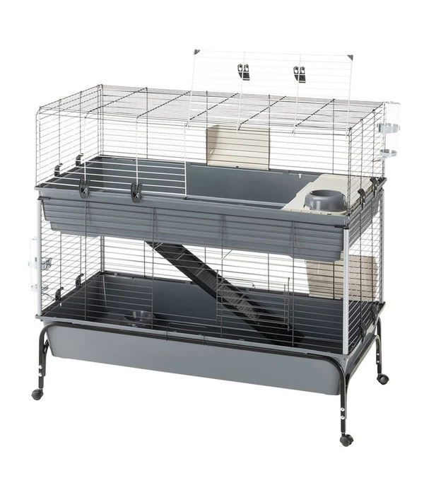 Ein Käfig für Kaninchen, Meerschweinchen oder andere Kleintiere sollte nicht nur komfortabel sein, sondern auch leicht zu reinigen. Das ist beim Nagerheim aus dem Hause ferplast sehr einfach möglich. Lösen Sie lediglich die Gitter und Böden mithilfe der Hakenlaschen voneinander und reinigen Sie danach die Kunststoffwannen rasch und unkompliziert. Auch das Bewegen und Umpositionieren des Stalls stellt dank der Metallstütze mit Rädern überhaupt kein Problem dar. Gönnen Sie Ihren geliebten Tieren diesen schönen und zugleich praktischen Rückzugsort und bestellen Sie das ferplast Nagerheim Rabbit 120 Double am besten noch heute!