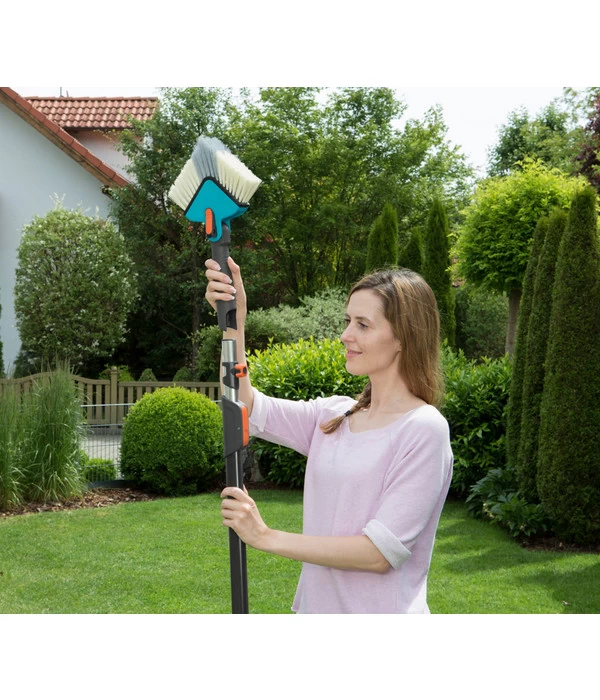 GARDENA begeistert bei dem combisystem Winkelbesen mit Flexibilität, denn das Werkzeug lässt sich vielfältig mit Stielen des Herstellers kombinieren. Wenn Sie also die gewünschte Stelle selbst auf Zehenspitzen nicht erreichen, können Sie einfach zu einem der Teleskopstiele von GARDENA greifen und so ganz locker selbst in luftiger Höhe arbeiten. Leiter und Tritt bleiben auf diese Weise im Geräteschuppen. Ein weiterer Pluspunkt des Besens ist dessen im Winkel verstellbarer Bürstenkopf, der auch knifflige Stellen zugänglich macht. Die Qualität der GARDENA Materialien spricht für sich und sorgt dafür, dass Sie lange Freude an dem Arbeitsgerät haben. Sie erhalten auf den GARDENA combisystem Winkelbesen eine 25 Jahre lange Garantie.