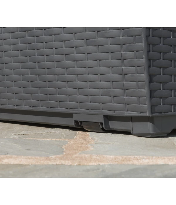 Mit der Rattan Style Aufbewahrungsbox Capri von Keter haben endlich Ihre Gartenutensilien oder Sitzpolster einen stylishen Platz. Die kleine Box aus Polypropylen in Rattanoptik mit 305 Liter Inhalt passt nicht nur perfekt auf die Terrasse, sie ist auch ideal für den Balkon oder Garten. Aufgrund ihrer absoluten Wetter- und UV-Beständigkeit kann die Keter Rattan Style Aufbewahrungsbox Capri das ganze Jahr über draußen bleiben, ohne zu verwittern. Und wenn Sie sie doch einmal in den Schuppen oder unter das Dach stellen möchten, helfen die integrierten Rollen zum Fortbewegen. Mit bis zu 40 kg lässt sich die Keter Rattan Style Aufbewahrungsbox Capri beladen und selbst als Sitzgelegenheit kann die schicke Kiste dienen: Bis zu 250 kg trägt nämlich der Deckel, der darüber hinaus auch noch abschließbar ist. Jedoch ist das Schloss nicht im Lieferumfang enthalten.