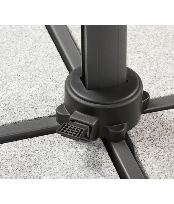Durch die Verstellbarkeit in 3 Dimensionen ist der Schneider Ampelschirm Rhodos Twist besonders praktisch. Über den Drehteller, der mit einem Fußpedal bedient wird, lässt sich der Schirm um 360° drehen. Entlang des Mastes ist eine Neigung um bis zu 80° möglich und per Handgriff ist der Schneider Ampelschirm Rhodos Twist bis zu 45° entlang des Auslegearms seitlich kippbar. Durch diese Flexibilität müssen nicht Sie dem Schattenfall des Schirmes folgen, sondern positionieren ihn einfach immer genau zwischen sich und der Sonne. Da in der Gestaltung des Schirms auf Volants verzichtet wurde, kann sich die Hitze nicht stauen und eingearbeitete Air-vents befördern die Luftzirkulation.